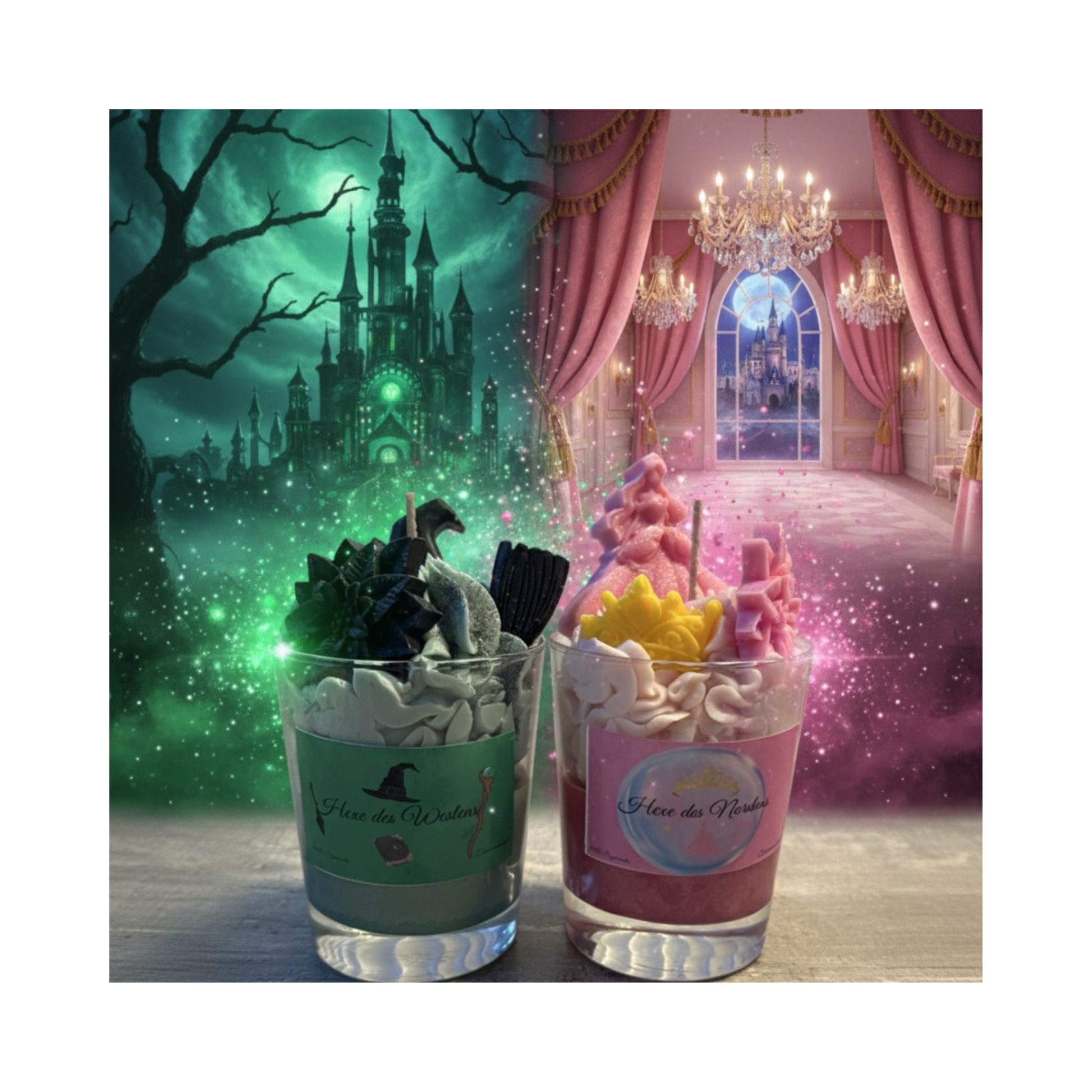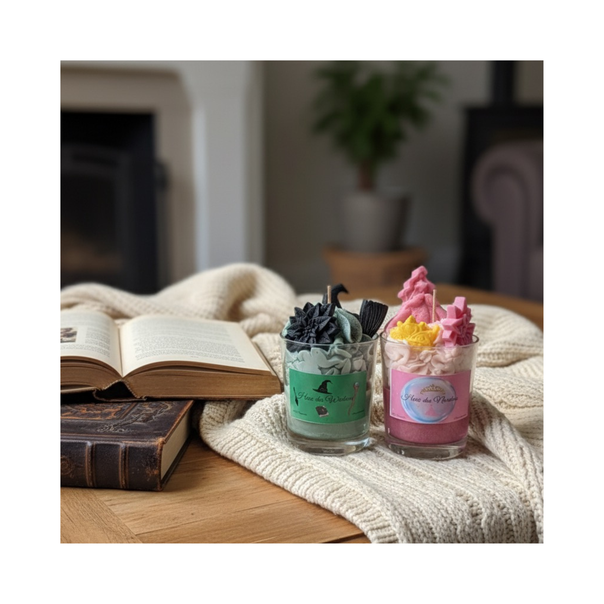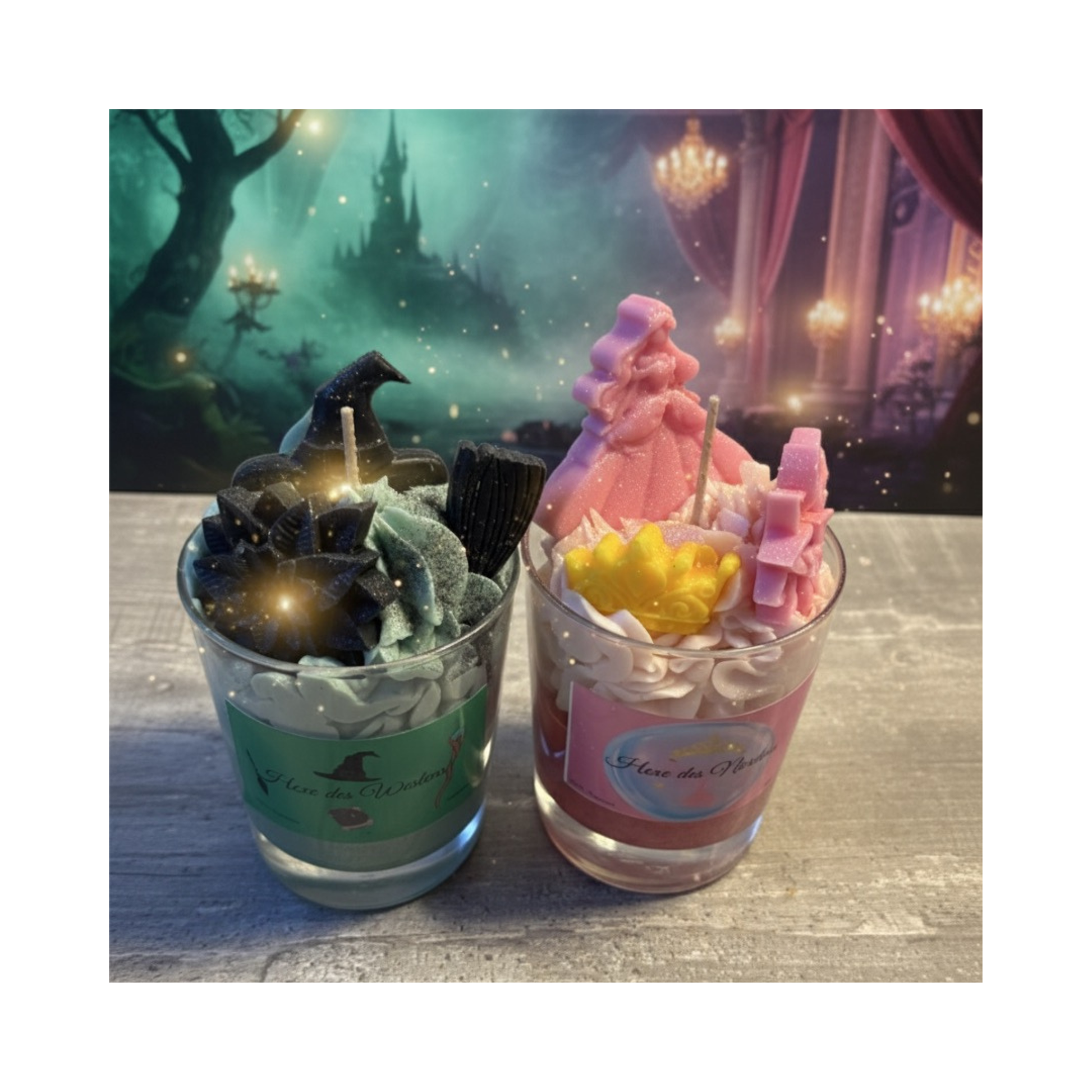 Das perfekte Duo für alle Hexen-Fans! Dieses Set vereint zwei zauberhafte Kerzen: die rosafarbene "Hexe des Nordens" mit cremiger rosa Sahne-Oberseite und die grüne "Hexe des Westens" mit ihrer charakteristischen grünen Sahne-Haube. Jede Kerze ist ein kleines Kunstwerk – ideal zum Verschenken oder um dein Zuhause in magische Atmosphäre zu tauchen. Lass dich von diesem charmanten Hexen-Abenteuer verzaubern!