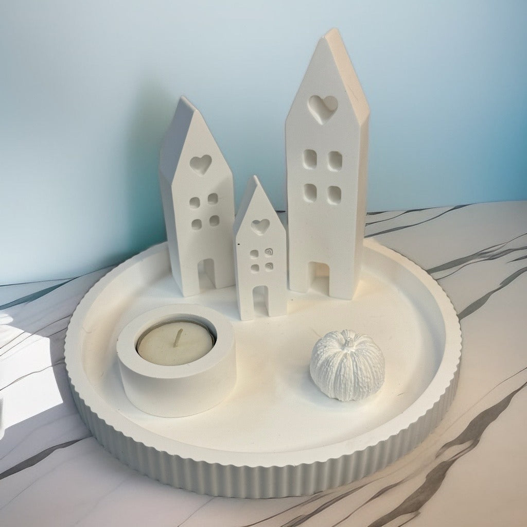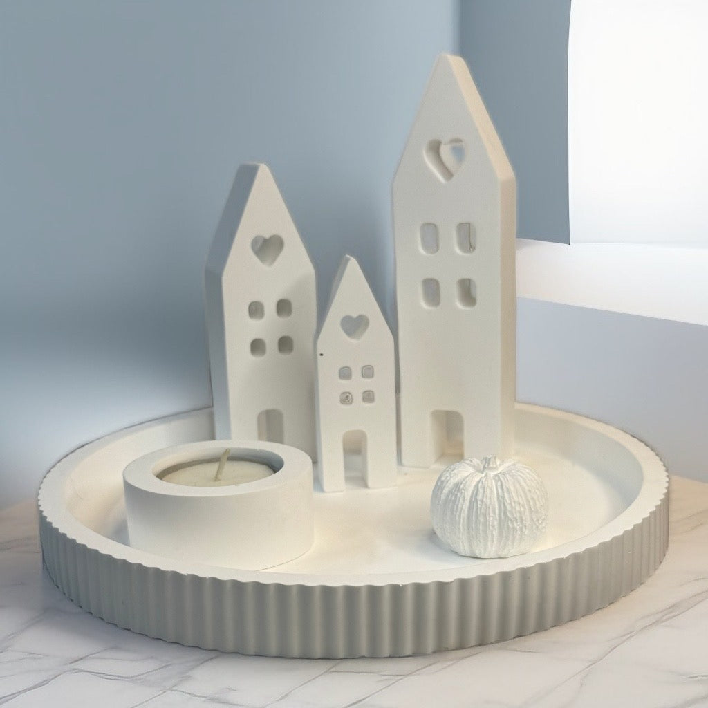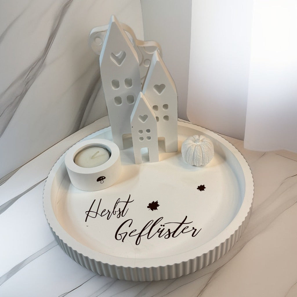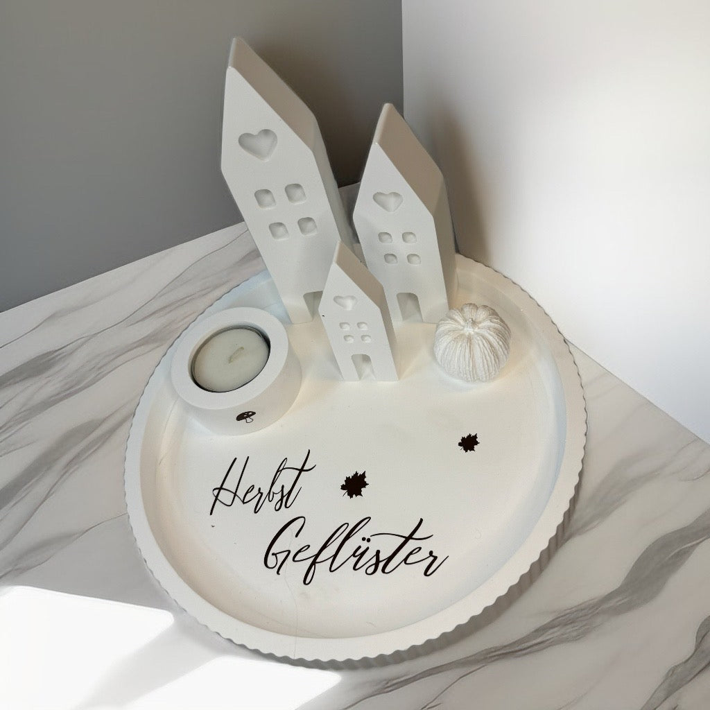 Das weiße Tablett „herbstliches Lichterdorf“ vereint drei zauberhafte Häuser, einen kleinen Kürbis und einen Teelichthalter zu einem verspielten Ensemble. Mit oder ohne Schrift bringt es gemütliches Licht und herbstlichen Charme in jedes Zuhause. Auch als Geschenk sorgt es für strahlende Augen und eine liebevolle Atmosphäre – perfekt, um Freude zu verschenken!